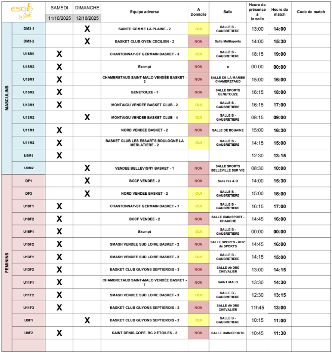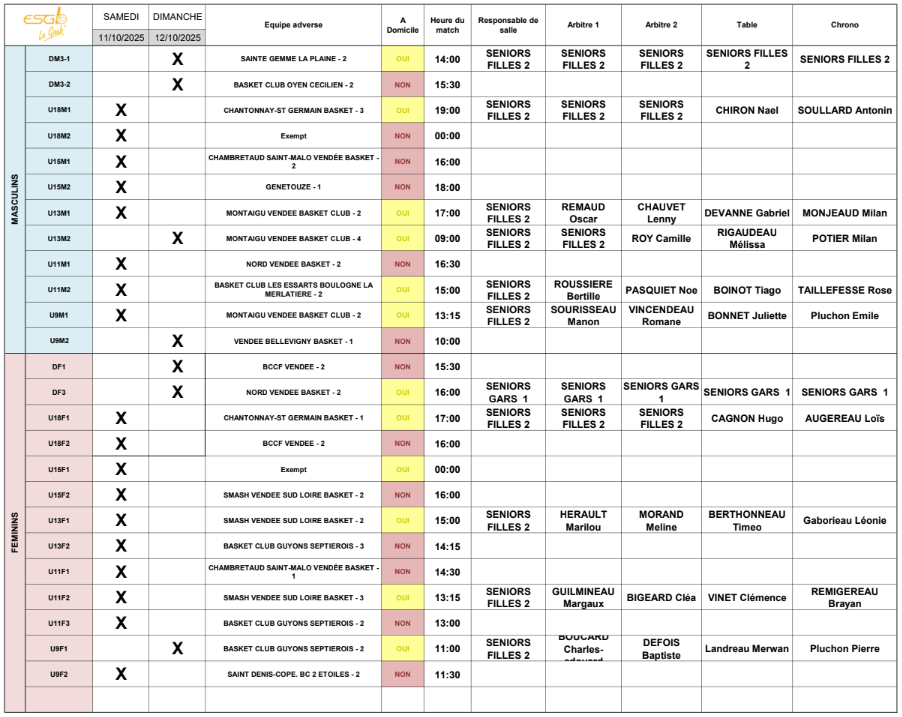 Veuillez noter que ce planning est susceptible d'être modifié à tout moment durant la saison.